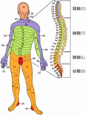 一つの目安として図を上げますが、痛みや痺れの発生箇所はこのような領域だったりもしています。