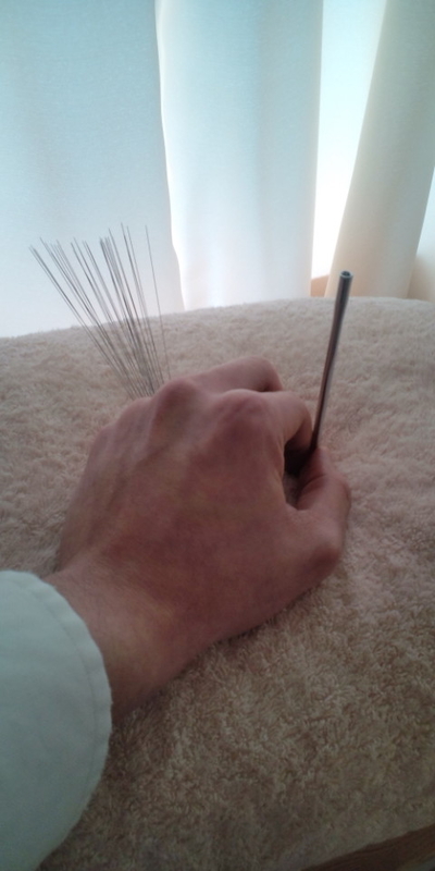 その為、薬指と小指に鍼を挟めつつ治療を行う方法はとりません。一本一本鍼皿から摘みます。